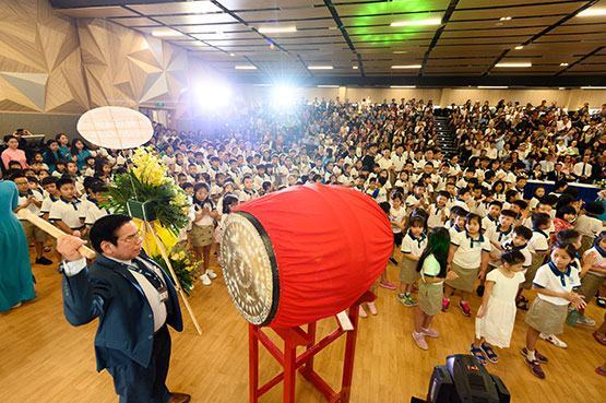 TS. Huỳnh Công Minh – Chủ tịch Hội đồng sáng lập & Tổng Hiệu trưởng Hệ thống Trường Song ngữ Quốc tế EMASI – đánh trống khai giảng năm học mới