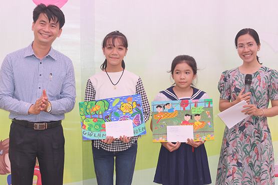 Thầy Trần Nguyên Thục (Trưởng phòng Chính trị tư tưởng, Sở GD-ĐT TP) trao giải thưởng cho hai thí sinh đạt giải nhất hội thi Vẽ tranh bảo vệ môi trường