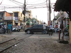 Mặc dù có tín hiệu tàu hỏa đến gần, nhưng chiếc xe ô tô du lịch màu đen này vẫn nằm chết gí trên đường ray cắt ngang với đường Thích Quảng Đức (Q.Phú Nhuận) (hình). Nguyên nhân là do lúc đó, xung quanh chiếc ô tô có rất nhiều loại xe gắn máy đang “bao vây”.