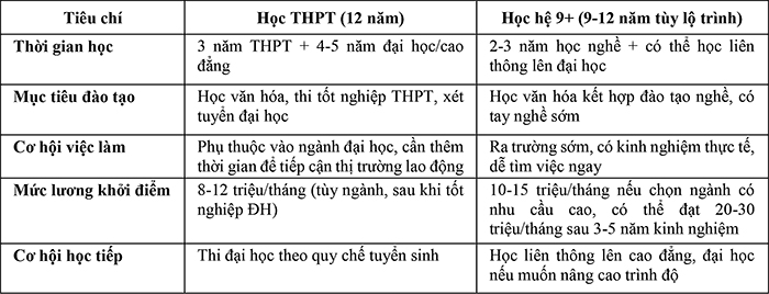 Tại TP.HCM, tỷ lệ học sinh tốt nghiệp THCS nhập học vào các trình độ giáo dục nghề nghiệp bình quân hàng năm đạt hơn 26%. Những số liệu này cho thấy xu hướng ngày càng tăng của học sinh và phụ huynh trong việc lựa chọn con đường học tập tập trung vào kỹ năng thực tiễn, nhằm đáp ứng nhu cầu của thị trường lao động hiện nay. Việc lựa chọn học THPT hay hệ 9+ không có đúng hay sai, mà tùy thuộc vào năng lực, sở thích và định hướng tương lai của từng học sinh. Nếu học sinh có định hướng học thuật, thích nghiên cứu chuyên sâu, THPT vẫn là lựa chọn hợp lý. Nhưng nếu muốn tiếp cận thị trường lao động sớm, có tay nghề và thu nhập ổn định ngay từ khi còn trẻ, hệ 9+ là một lựa chọn đáng cân nhắc.