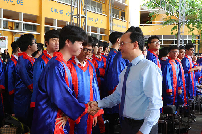 Tại buổi lễ tri ân và trưởng thành sáng 15-6, Hiệu trưởng Trường THPT Ten Lơ Man (quận 1, TP.HCM) nhắn nhủ học sinh lớp 12: tương lai các em là do chính các em viết nên. Hãy viết bằng nỗ lực, bằng lòng tử tế, bằng sự can đảm và khát vọng bay xa.