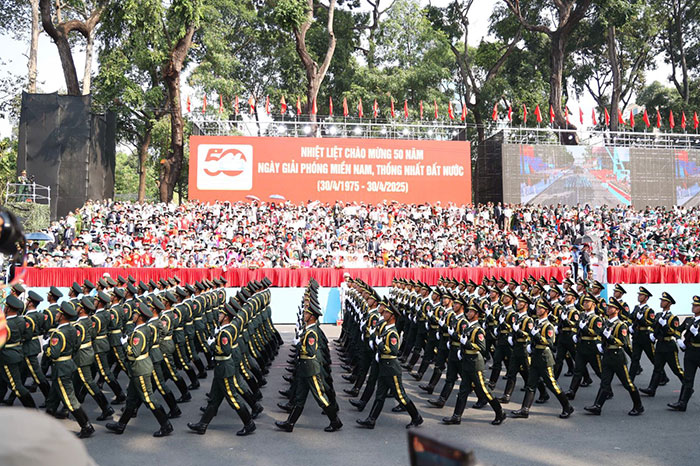 Trong Lễ kỷ niệm 50 năm Ngày Giải phóng miền Nam, nhìn từ trên cao, các khối diễu binh như một dải màu sắc sống động, hòa quyện giữa những bước chân đều đặn, cờ hoa rực rỡ, trong sự chào đón hân hoan của người dân hai bên đường.
