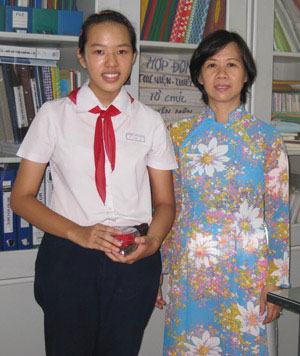Tú Linh (trái) cùng cô Hiệu trưởng Trường THCS Phú Mỹ |