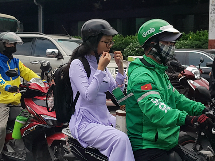 Dạo quanh các cổng trường THCS, THPT trên địa bàn TP.HCM, vào giờ đến trường và tan trường có rất nhiều học sinh đặt xe công nghệ để đưa đón. Tại cổng trường THPT Nguyễn Thị Minh Khai, em Trần Thị Thảo Ngọc (lớp 10) cho biết, cha mẹ em bận đi làm nên không thể đưa đón em mỗi ngày. Em có nói cha mẹ sắm xe đạp điện để em tự đi học nhưng cha mẹ khuyên em nên đặt xe công nghệ vừa nhanh lại đảm bảo an toàn. “Đến nay em đã có 2 năm đi học bằng xe công nghệ. Em thấy đến trường bằng phương tiện này cũng tiện lợi. Mỗi sáng em đặt xe trước 10 phút, trừ thời gian xe đến trễ. Khi xe đến cổng nhà em đã chuẩn bị sẵn sàng để đến trường”, Ngọc chia sẻ.