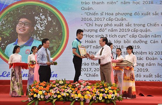 Giám đốc Sở GD-ĐT TP Lê Hồng Sơn (bìa phải) tuyên dương các HS tiêu biểu tại Cụm trại 6. Ảnh: N.Trinh