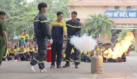 Các chiến sĩ PCCC hướng dẫn học sinh sử dụng bình chữa cháy dập lửa