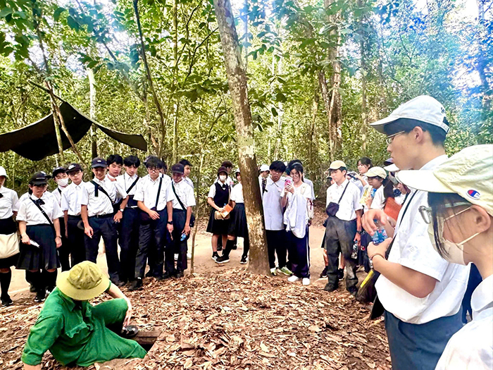 Ngay sau lễ hội văn hóa truyền thống tại Thảo Cầm Viên, học sinh và giáo viên Nhật Bản tiếp tục tham quan trải nghiệm tại Địa đạo Củ Chi với sự hướng dẫn của học sinh Trường THCS Võ Trường Toản.