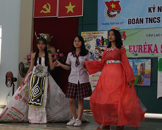 Trường THPT Thủ Đức (TP.HCM) vừa tổ chức hội thi “EURE’KA – Sức sống sáng tạo” dành cho học sinh toàn trường, với 2 phần: thi nét đẹp 3T và game show hướng nghiệp. Trong đó, nét đẹp 3T là phần thi sử dụng nguyên liệu tái chế để tạo ra những sản phẩm handmade mô phỏng về ngành nghề và các sản phẩm thời trang của nhiều nghề khác nhau trong xã hội. Cụ thể, với 26 mẫu thiết kế được làm từ những nguyên liệu như giấy báo, áo mưa, bao bì, nắp chai, ống hút… đã mang đến góc nhìn mới lạ về trang phục của nhiều nghề như giáo viên, văn phòng, tiếp viên hàng không, lao công… Qua đó gióng lên tiếng nói về việc bảo vệ môi trường, hạn chế rác thải, tận dụng rác thải để phục vụ cuộc sống. Cũng là kiến thức về ngành nghề nhưng game show hướng nghiệp lại được thực hiện bằng các phần thi tài năng, thể hiện sự hiểu biết của học sinh về từng ngành nghề, từ đó giúp các em đưa ra những cách hiểu đúng đắn nhất về các ngành nghề đó.