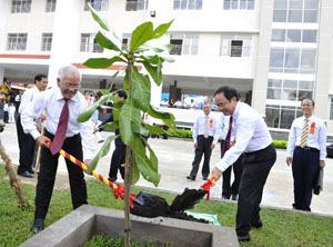 Nhân dịp khai giảng năm học và khánh thành trường mới – Trường THPT Nguyễn Hữu Thọ (Q.4, TP.HCM), Chủ tịch UBND TP Lê Hoàng Quân (trái) phát động trồng cây bàng vuông trong chương trình Học sinh TP hướng về biển đảo.