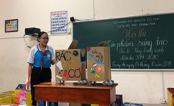 Sân chơi ý nghĩa này vừa diễn ra tại Trường THCS Trung An (huyện Củ Chi, TP.HCM) thông qua Hội thi “Sáng tạo sản phẩm tái chế” năm học 2019-2020. Theo đó, với chủ đề “Ứng dụng xanh”, hội thi khuyến khích sự sáng tạo của học sinh để làm ra những sản phẩm hữu ích từ các vật liệu tái chế như: thùng giấy, chai nhựa, chậu – xô bể… Tham gia hội thi, mỗi lớp (20 lớp) chế tạo ra 2 sản phẩm là thùng rác tái chế (1 vô cơ, 1 hữu cơ) trong thời gian 1 tuần. Thầy Nguyễn Văn Tuông (Hiệu trưởng nhà trường) cho biết đây là năm đầu tiên nhà trường tổ chức hội thi với mong muốn đa dạng hóa và nâng cao hiệu quả các hình thức bảo vệ môi trường, giáo dục học sinh ý thức bảo vệ môi trường, phân loại rác thải. Đồng thời hướng học sinh tận dụng các sản phẩm tái chế để tạo thành những sản phẩm có ích trong cuộc sống. Bên cạnh đó, hội thi còn là sân chơi mở ra sự sáng tạo, trang bị các kỹ năng làm việc nhóm, kỹ năng thuyết trình cho học sinh. Kết quả, lớp 9/5 giành giải nhất, lớp 9/3 giải nhì và lớp 8/4 giải ba.
