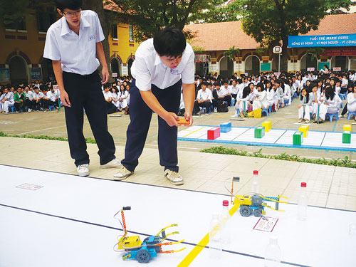 Tuần qua, sân trường THPT Marie Curie (TP.HCM) sôi động bởi những tiếng reo hò, cỗ vũ cho các đội thi thiết kế, lập trình và điều khiển robot.