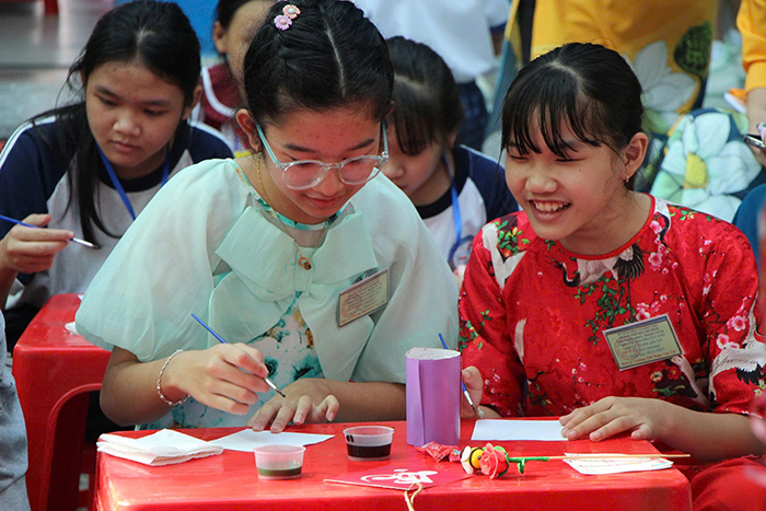 Gần 1.000 học sinh tiểu học đến từ 6 quận, huyện: Tân Bình, Tân Phú, Phú Nhuận, quận 12 và huyện Hóc Môn, Củ Chi đã được thỏa sức trải nghiệm, khám phá các trò chơi dân gian ngày Tết như ô ăn quan, ném còn, nhảy sạp, viết thư pháp, nặn tò he… tại Ngày hội giao lưu học sinh tiểu học “Xuân gắn kết – Tết yêu thương” năm học 2024-2025.