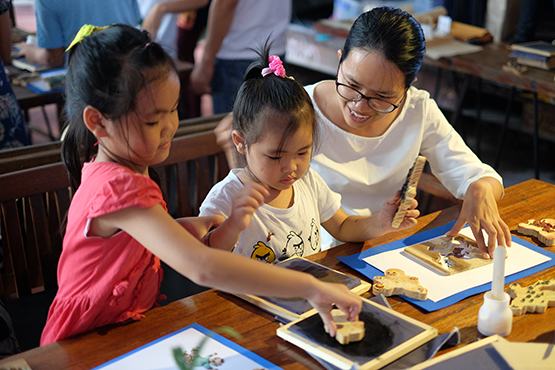 | Phụ huynh và học sinh trải nghiệm làm tranh Đông Hồ |