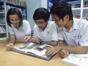 Bùi Thành Đạt (giữa) thảo luận cùng bạn bè tại thư viện trường |