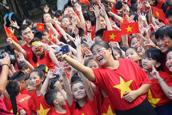 Cùng ngày, hàng ngàn học sinh, giáo viên Trường Tiểu học Nguyễn Văn Trỗi (Quận 4) cũng mặc trang phục cờ đỏ sao vàng xếp hình trái tim và hô vang khẩu hiệu “Việt Nam vô địch”.