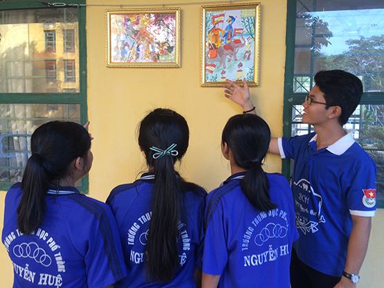 Hc sinh Trưng THPT Nguyn Hu thích thú vi các bc tranh tái hin nhân vt lch s Vit Nam