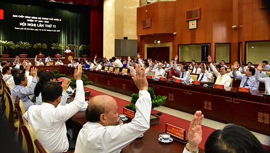 Báo cáo Dự thảo NQ Hội nghị Thành ủy lần thứ 11, Phó bí thư Thường trực Thành ủy Tất Thành Cang nêu rõ: Giao Ban thường vụ Thành ủy căn cứ ý kiến thảo luận tại Hội nghị, báo cáo tiếp thu, giải trình của Ban cán sự Đảng UBND TP, Văn phòng Thành ủy và kết luận chỉ đạo Hội nghị của đồng chí Bí thư Thành ủy để lãnh đạo, chỉ đạo Ban cán sự Đảng UBND TP hoàn thiện đề án xây dựng TP.HCM trở thành đô thị thông minh giai đoạn 2017- 2020, tầm nhìn 2025.