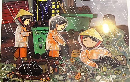 Là cá nhân đạt giải nhì thể loại tranh giấy, em Nguyễn Lê Kim Ngân (Trường THPT Lương Văn Can, quận 8) đã thể hiện bức tranh súc tích với chủ đề “Sự vất vả vinh quang của chúng tôi”. Nội dung bức tranh là hình ảnh những người công nhân vệ sinh, đang cần mẫn thu dọn rác thải trong thời tiết mưa gió. Theo Ngân, sự nhọc nhằn, vất vả tưởng rất nhỏ bé nhưng góp phần bảo vệ môi trường, giúp cho thành phố sạch đẹp, nên cần được tôn vinh. Cũng thể hiện chủ đề bảo vệ môi trường, em Phạm Nguyễn Phương Uyên (Trường Thực hành Sài Gòn, quận 5) đã vẽ nên bức tranh “Hành tinh xanh của chúng ta”. Bằng nét vẽ sắc sảo và cách sử dụng gam màu nóng lạnh chủ đạo, thí sinh đã chuyển tải thông điệp bảo vệ hành tinh bằng cách không chặt bỏ cây xanh, không xả rác bừa bãi, hạn chế xả khói công nghiệp và khí thải của các phương tiện xe cơ giới. Bên cạnh vấn đề bảo vệ môi trường, tranh vẽ ở các thể loại cũng thể hiện nhiều đề tài hay như “Quê em” (tác giả Huỳnh Ngọc Khánh An, lớp Lá 4 Trường Mầm non 14, quận Tân Bình); “Mẹ và Bống” (tác giả Nguyễn Tăng Bảo Châu, lớp Lá 2 Trường Mầm non Rạng Đông 11A); Em yêu lịch sử Việt Nam (tác giả Tô Thế Như, lớp 4/2, Trường Tiểu học Tạ Uyên, huyện Nhà Bè); “Ước mơ đến trường” (tác giả Hoàng Phương Vy, lớp 2/4, Trường Tiểu học Bàu Sen, quận 5); “Trồng cây công nghệ 4.0” (tác giả Trần Minh Trọng Nhân, Trường THCS Lê Quý Đôn, quận 3)…