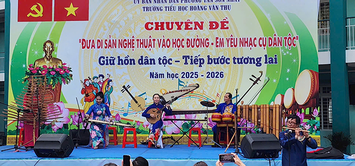 Sáng 12-4, hơn 1.000 học sinh Trường Tiểu học Hoàng Văn Thụ (phường Tân Sơn Nhất, TP.HCM) đã vô cùng thích thú khi được trải nghiệm các loại nhạc cụ dân tộc truyền thống như đàn tranh, đàn bầu, đàn nhị, sáo trúc trong chuyên đề “Đưa di sản nghệ thuật vào học đường – Em yêu nhạc cụ dân tộc”.