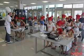 Các em thiếu nhi chăm chú nghe giáo viên hướng dẫn làm bánh
