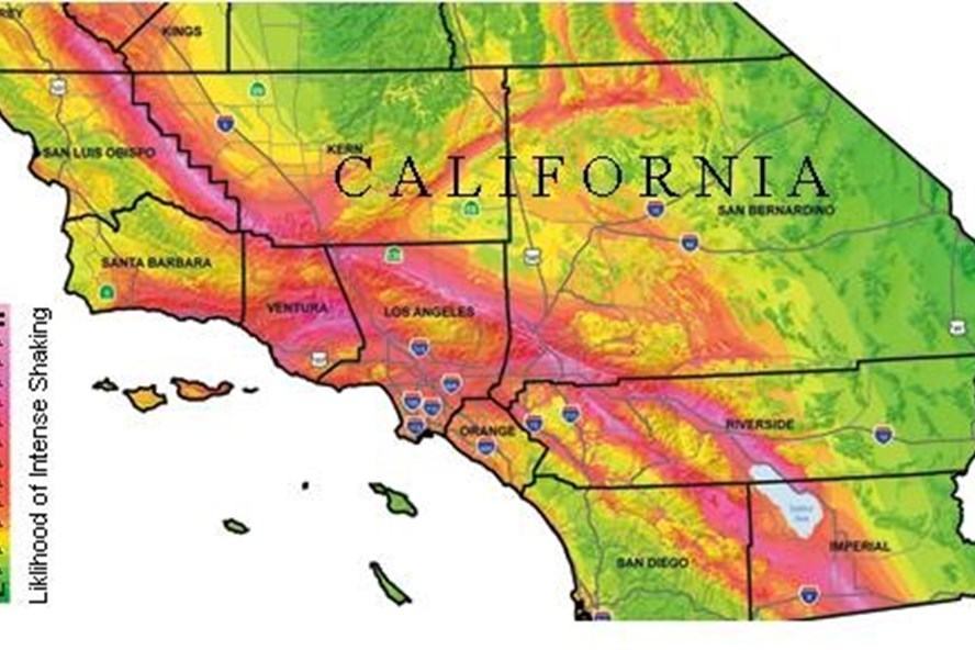 Bản đồ dự báo khả năng xảy ra động đất ở các khu vực dọc theo đường đứt gãy tại tiểu bang California, Mỹ.