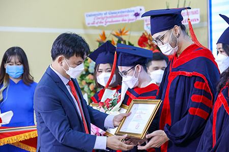 Lãnh đạo trường trao giấy khen cho sinh viên tại lễ tốt nghiệp