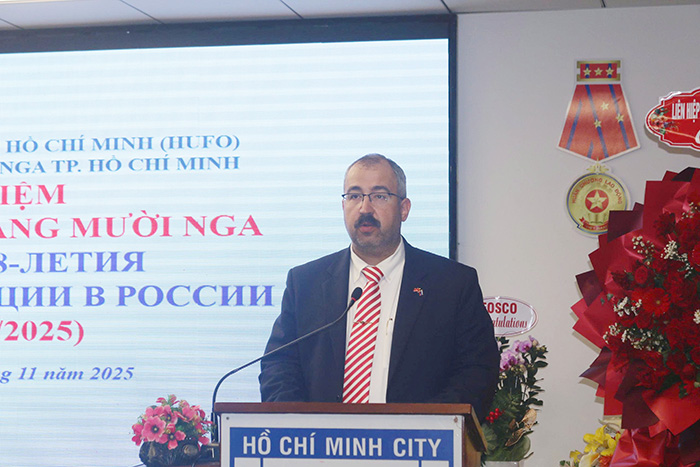 Ông Timur Sirozevich Sadykov – Tổng Lãnh sự Liên bang Nga tại TP.HCM, khẳng định, Cách mạng Tháng Mười Nga đã mở ra kỷ nguyên mới cho nhân loại, thúc đẩy phong trào giải phóng dân tộc trên toàn cầu.
