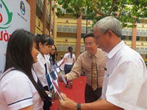 Ông Trần Quang Hùng – Hiệu trưởng Trường THPT Củ Chi (đứng gần) và TS. Lê Phước Hùng – Phó trưởng phòng Tuyển sinh Trường ĐH Văn Hiến – trao học bổng cho học sinh trong chương trình tư vấn