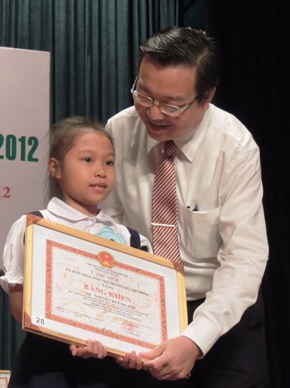 Thành ủy viên – Giám đốc Sở GD-ĐT TP Lê Hồng Sơn trao tặng Bằng khen của UBND TP cho VĐV xuất sắc tại Lễ tổng kết HKPĐ năm 2012 của TP