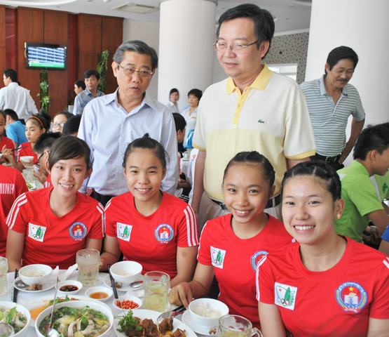 Nguyên Phó Chủ tịch UBND TP, ông Hứa Ngọc Thuận và ông Lê Hồng Sơn – Giám đốc Sở GD-ĐT thăm hỏi các VĐV tại HKPĐ năm 2012