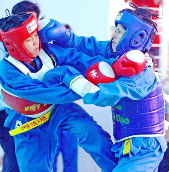 VĐV Hồng Nga TP.HCM (trái) đoạt huy chương vàng môn Vovinam tại HKPĐ lần VIII trước VĐV Hồng Thắm (Vĩnh Long)