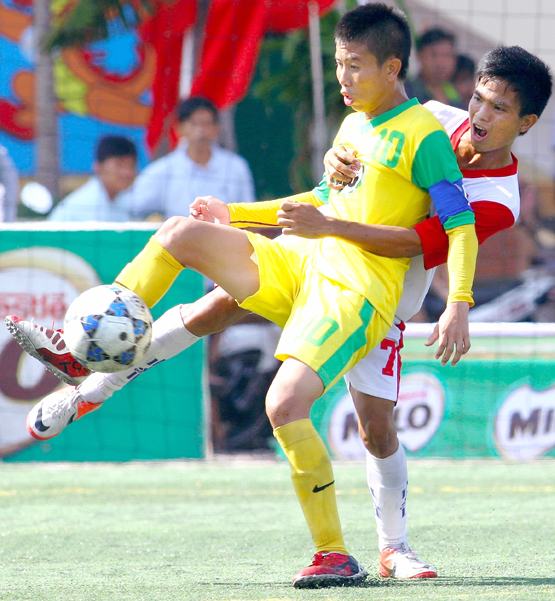 VĐV Nguyễn Quang – TP trong một pha bóng kỹ thuật trước VĐV của đội tuyển THPT Nghệ An