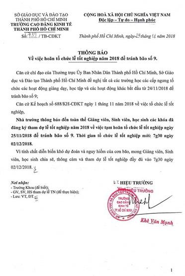 Thông báo dời lễ tốt nghiệp của Trường CĐ Kinh tế TP.HCM để tránh bão