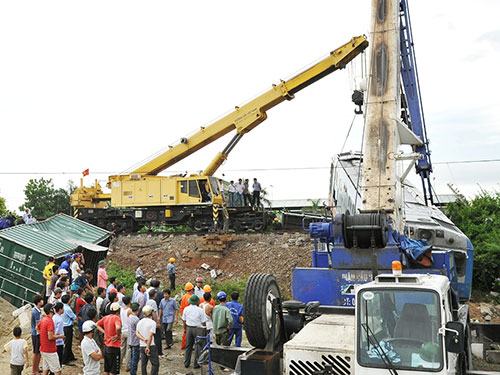 Lực lượng cứu hộ đã cắt rời 3 toa tàu, xe đầu kéo container và rơ-moóc ra khỏi khu vực tai nạn. Tuy nhiên, một phần đầu tàu nặng 86 tấn vẫn nằm trên đường ray. Ngành đường sắt đã điều 1 cần cẩu 100 tấn và 2 cần cầu đường bộ 80 tấn từ Hà Nội xuống kéo tàu lửa ra khỏi hiện trường nhưng không thành công. Do vậy, ngành đường sắt phải thuê tiếp 1 cần cẩu 135 tấn ở TP Hải Phòng nhưng đến chiều tối 11-7 vẫn chưa thể giải tỏa hiện trường. “Thiết bị cứu hộ của mình đầu tư nhiều thì không có tiền, đầu tư ít thì như vậy đấy!” – ông Bình nói.