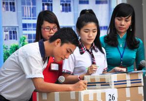 Thí sinh TP.HCM kiểm tra thùng đề thi tại kỳ thi tốt nghiệp THPT 2014 vừa qua. Ảnh: Lộc Sâm