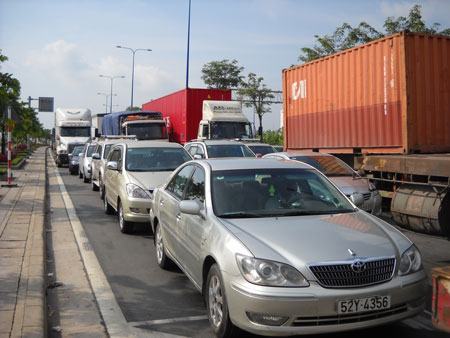 Tại đây, hàng trăm xe tải, xe container, xe ô tô lưu thông từ hướng cảng Cát Lái ra xa lộ Hà Nội nối đuôi nhau trên đường nhích từng tý một. Do dòng xe ô tô, xe tải, xe container dày đặc trên đường nên xe gắn máy của người dân phải chạy lên vỉa hè để lưu thông.