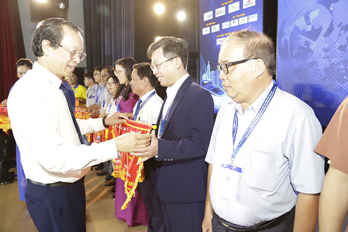 Thứ trưởng Phạm Ngọc Thưởng trao cờ lưu niệm cho các đơn vị tham gia dự thi