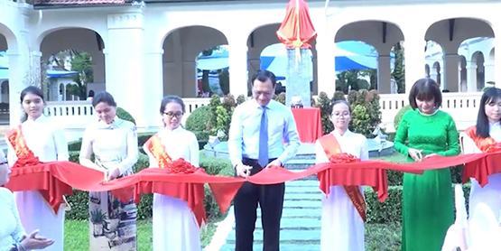 | Ông Lê Hoài Nam, Phó Giám đốc Sở GD-ĐT TP.HCM và bà Nguyễn Thị Yến Trinh cắt băng khánh thành tượng đài cố Tổng Bí thư Lê Hồng Phong |