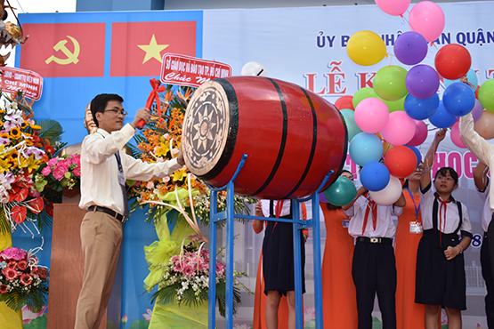 | Ông Lê Đình Thảo – Hiệu trưởng nhà trường đánh trống khai giảng năm học mới |