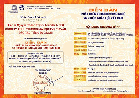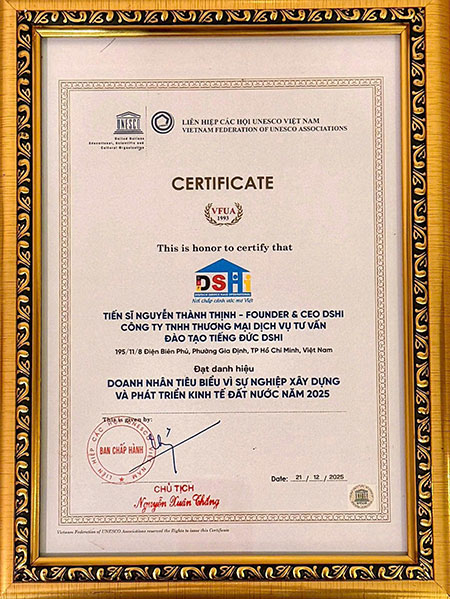 Trong bối cảnh Việt Nam đang đẩy mạnh chuyển đổi số và hội nhập quốc tế, bài toán nâng cao chất lượng nguồn nhân lực trở nên cấp thiết hơn bao giờ hết. Tại “Diễn đàn phát triển giáo dục, khoa học, công nghệ và nguồn nhân lực Việt Nam năm 2025” do Liên hiệp các Hội UNESCO Việt Nam tổ chức vừa qua, Công ty TNHH Tư vấn Đào tạo Tiếng Đức DSHi (DSHi) đã khẳng định vị thế tiên phong. Đặc biệt, TS. Nguyễn Thành Thịnh – Founder & CEO DSHi đã vinh dự được trao tặng danh hiệu “Doanh nhân cống hiến vì sự nghiệp xây dựng kinh tế và phát triển đất nước” – một sự ghi nhận xứng đáng cho 30 năm tâm huyết với nghề “trồng người”.