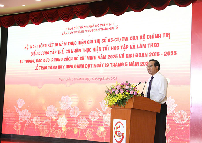 Chiều 17-5, Đảng ủy UBND TP.HCM tổ chức Hội nghị tổng kết 10 năm thực hiện Chỉ thị số 05 của Bộ Chính trị; biểu dương, khen thưởng các tập thể, cá nhân có thành tích trong “Học tập và làm theo tư tưởng, đạo đức, phong cách Hồ Chí Minh” và Lễ trao tặng huy hiệu Đảng đợt 19-5.