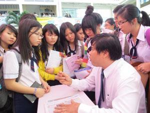 Chuyên viên tư vấn trong chương trình hướng nghiệp “Đúng ngành nghề, sáng tương lai” trả lời thắc mắc của học sinh. Ảnh: N.Anh