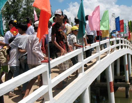 | Trẻ em và người lớn nô nức qua cầu mới bắc qua một con kênh tại huyện Cầu Ngang, Trà Vinh. Ảnh: V.L. |