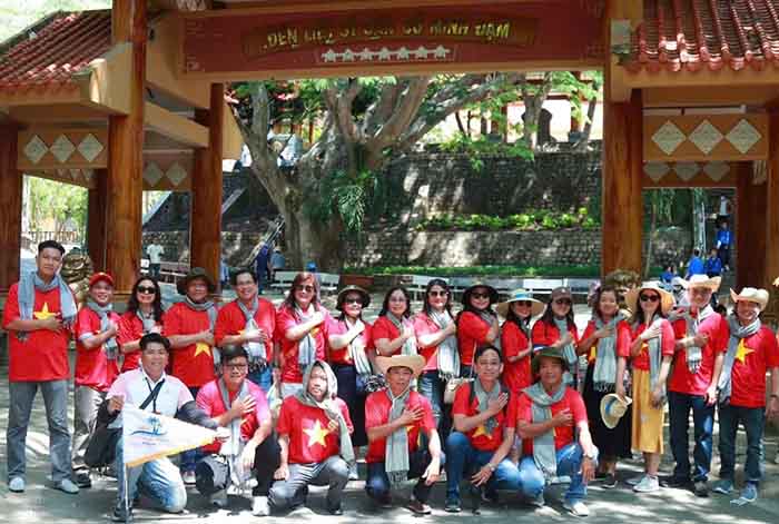 Các đảng viên Đảng bộ Trường THPT Ngô Quyền chụp hình lưu niệm tại Đền liệt sĩ Căn cứ Minh Đạm