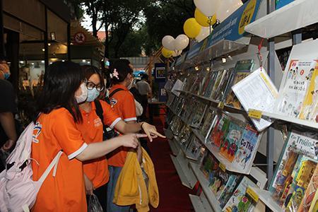 Các bạn trẻ tìm hiểu gian hàng trưng bày sách