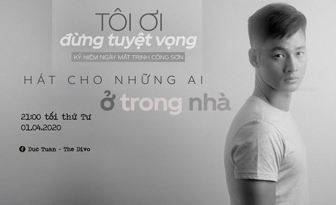 Trong chuỗi chương trình livestream Hát cho những ai ở nhà (vào tối thứ tư và thứ bảy hằng tuần), ca sĩ Đức Tuấn chia sẻ về đêm nhạc đặc biệt: “Trong chuỗi các đêm nhạc Đức Tuấn tuần này có dành một đêm gặp gỡ người yêu nhạc lúc 21 giờ tối nay (1.4) qua chủ đề nhạc Trịnh Tôi ơi đừng tuyệt vọng. Chủ đề này rất đúng với tình hình mùa dịch, mong mọi người đừng tuyệt vọng mà hãy bình tĩnh rồi mọi chuyện sẽ qua để đón những ngày tươi sáng sắp tới. Tôi sẽ hát mộc hơn 1 giờ về nhạc Trịnh ngay tại nhà nhạc sĩ Trịnh Công Sơn (ở TP.HCM – NV). Cùng xuất hiện với tôi có em gái nhạc sĩ là ca sĩ Trịnh Vĩnh Trinh”.