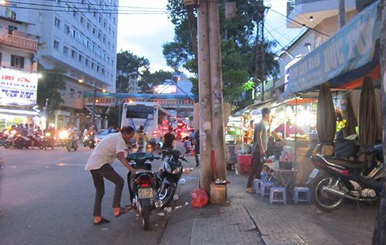 | Lấn chiếm vỉa hè làm nơi buôn bán tại đường Cống Quỳnh – Q.1 (ảnh chụp tối 30-5) |