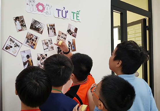 Các em học sinh xem hình ảnh trên bảng Hoa tử tế