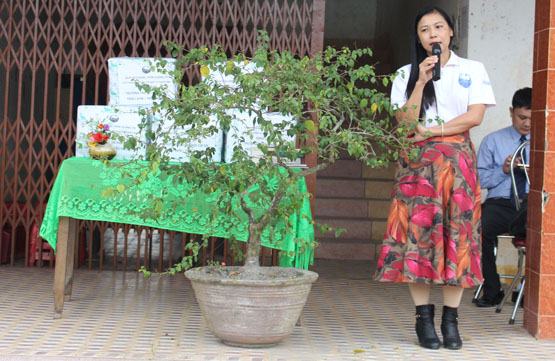 Cô Lê Nam Linh đang giới thiệu sách tại Trường THCS Triệu Sơn