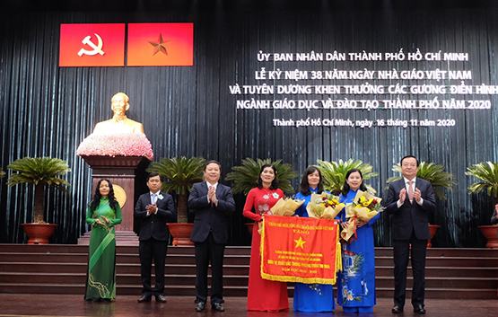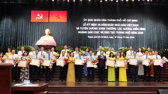 Ngày 16-11, UBND TP.HCM tổ chức lễ kỷ niệm 38 năm Ngày Nhà giáo Việt Nam và tuyên dương khen thưởng các gương điển hình ngành GD-ĐT TP.HCM năm 2020. Đến dự có các đồng chí: Phó Bí thư Thành ủy, Chủ tịch HĐND TP Nguyễn Thị Lệ; Ủy viên Ban thường vụ, Trưởng Ban Dân vận Thành ủy Nguyễn Hữu Hiệp; Thành ủy viên, Phó Chủ tịch UBND TP Dương Anh Đức; Phó Giám đốc Sở Nội vụ, Trưởng Ban thi đua Khen thưởng TP Ngô Thị Hoàng Các; Giám đốc Sở GD-ĐT TP Lê Hồng Sơn và đại biểu các sở, ngành khác cùng các thầy giáo, cô giáo đại diện cho hơn 90.000 nhà giáo đang công tác trong ngành giáo dục TP.